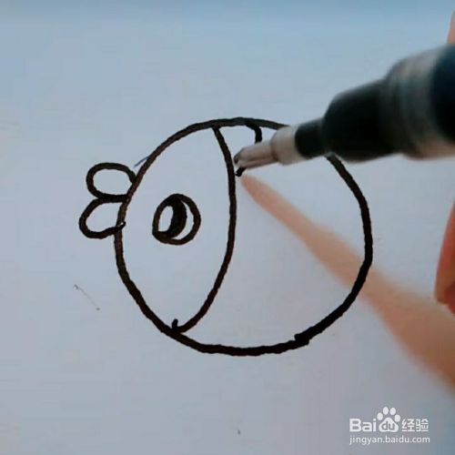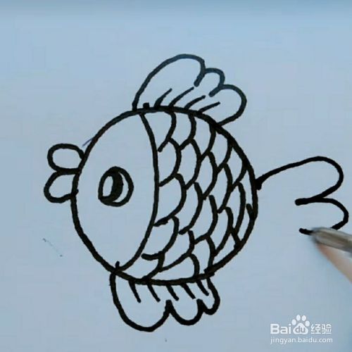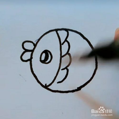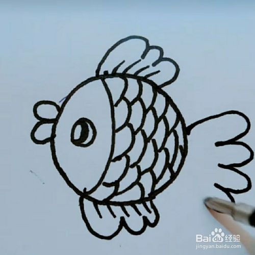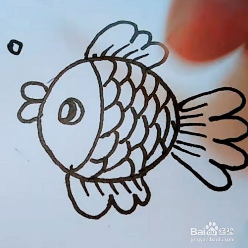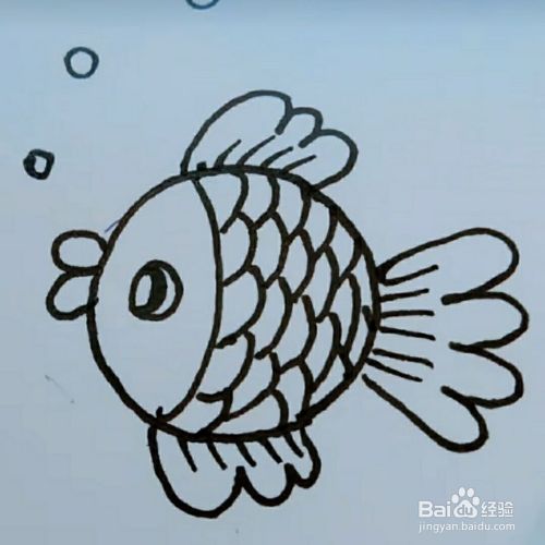 第七,这样一只可爱简单地小鱼就画法了,最后在嘴边画两个泡泡,就有一种小鱼在水里的感觉了,是不是很简单易学呢。