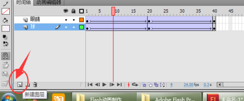 在第20帧的时候球是向下的 所以眼睛在20帧处要添加“关键帧” 而眼睛也要向下移动到相应的位置上 在“眼睛”位置上1-20帧之前添加一个“传统补间”同样的方法操作下一个40帧处