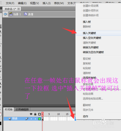 这个时候我们可以看到“帧”的那个地方原先是空的 现在变实心的了 这是因为这个帧上有东西了(眼睛)