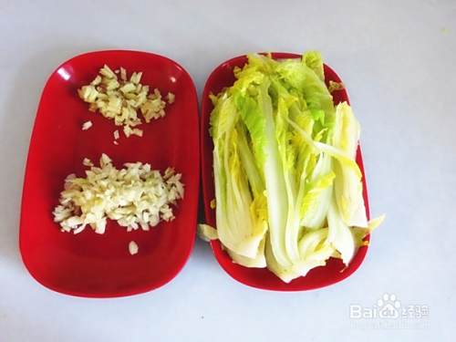 把娃娃菜用开水烫软,蒜和姜剁碎