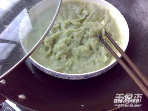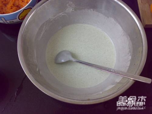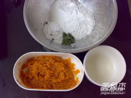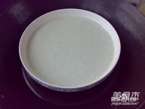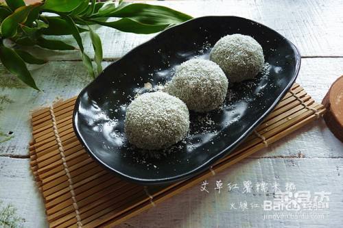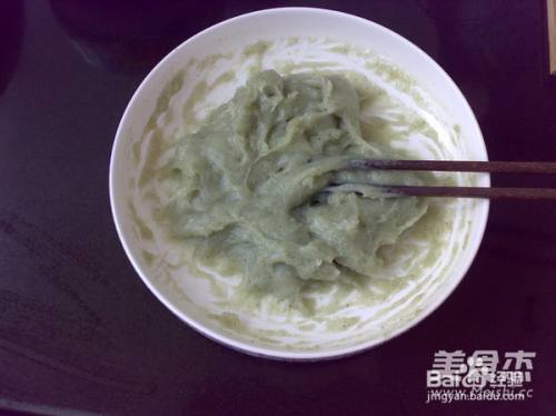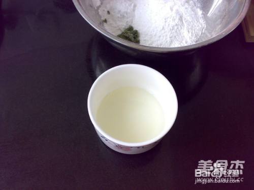 3艾草粉、糯米粉、澄粉放一起,加进糖水拌成浆