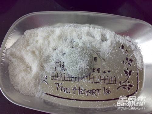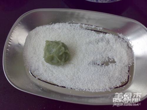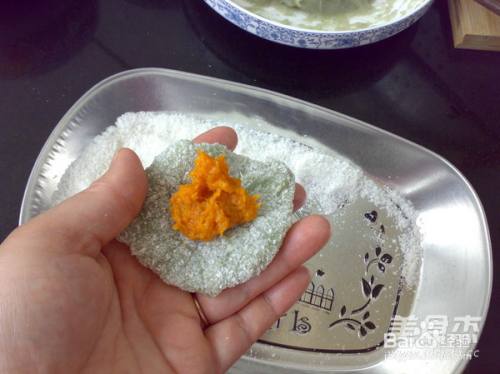 8让粉团粘上椰蓉后按扁放适量的红薯泥
