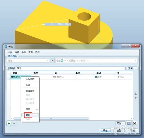 我们在参数对话框中,把参数名复制下来,定义关系需要使用参数名和特征名,这两个名称都需要准确。