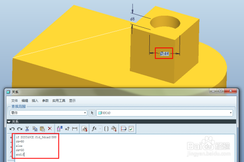 在关系中我们输入一个判断语句,通过判断距离参数是否大于300来定义孔的直径数值。这里要注意,参数和特征名必须正确,还要参照标准书写格式。