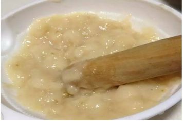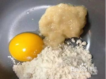 将香蕉泥、蛋黄、面粉、水或鲜奶混合搅拌成面糊(如果小孩子对牛奶过敏的话,可以加母乳,没有母乳的话,可以加水)