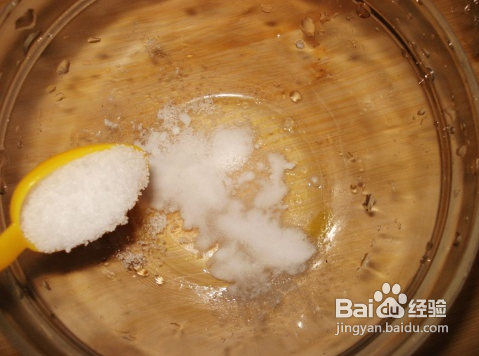 在小碗里放2克碱面和一勺盐用一勺温水化开。