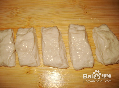 将面团用手摊成长方形,切成3cm宽的长条。
