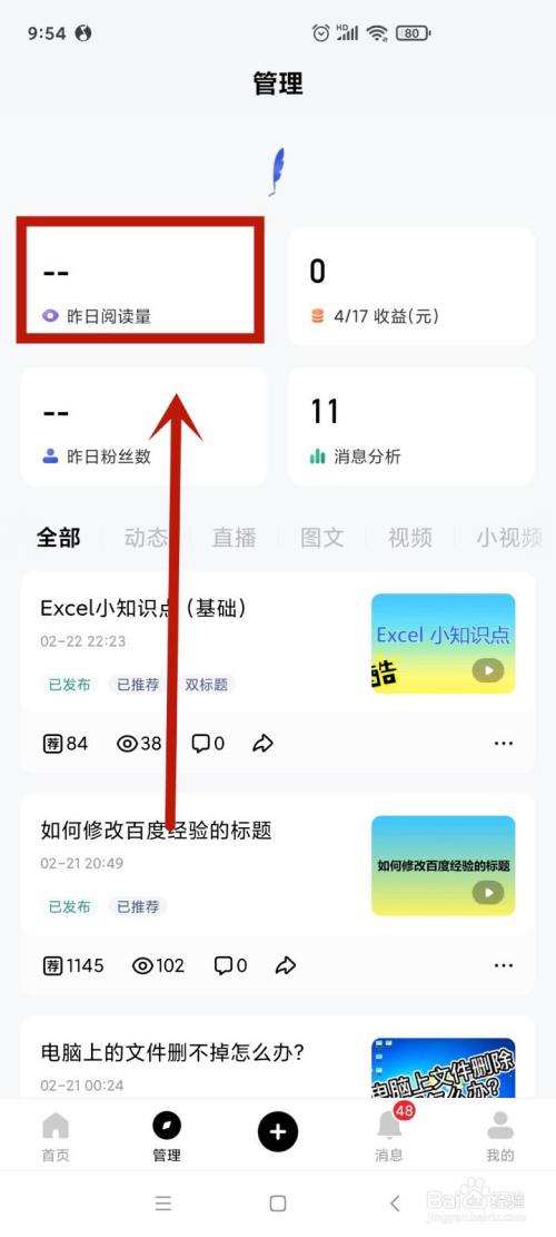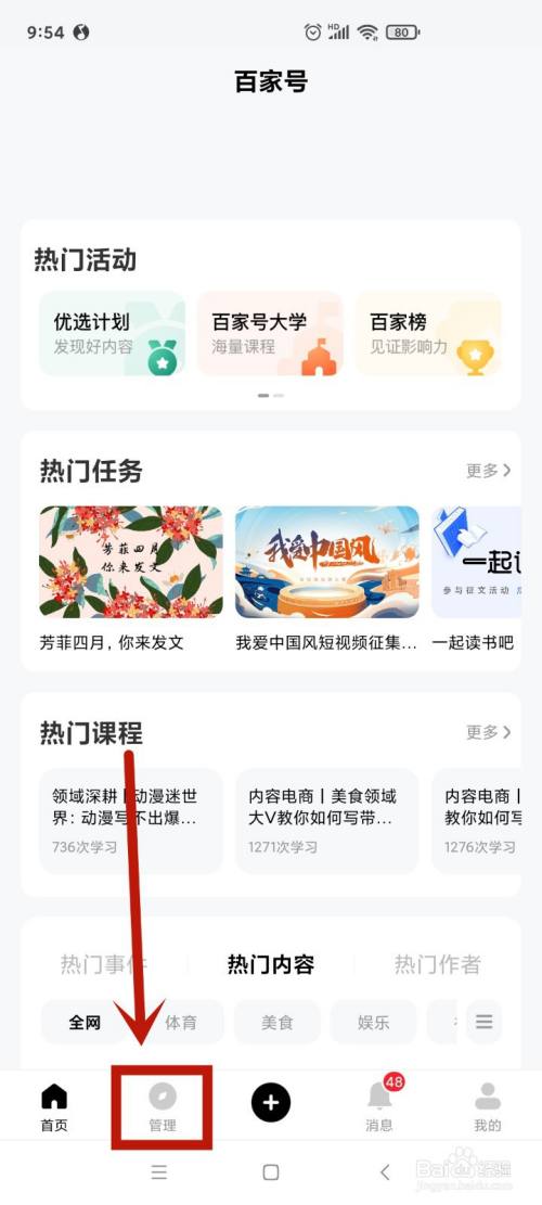 打开“百家号”软件,点击“管理”按钮。