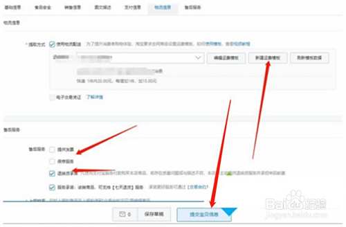 运费模板信息界面设置可以新建运费模板,然后勾选下面的“售后服务”,设置完成之后点击“提交宝贝信息”即可完成。