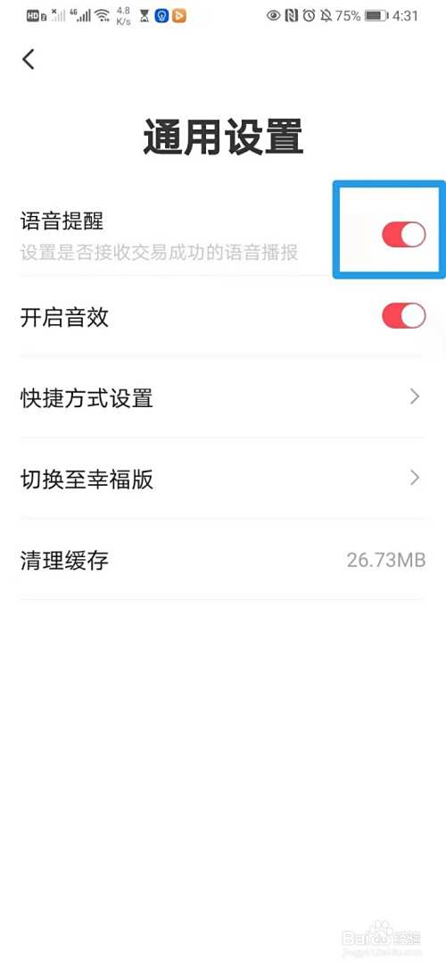 进入新页面,将“语音提醒”后面的按钮滑动至红色。