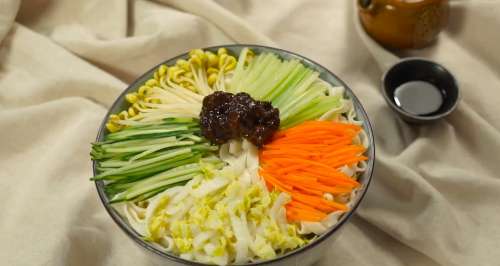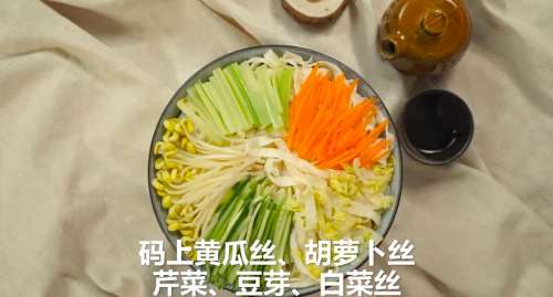 7码上黄瓜丝、胡萝卜丝、芹菜、豆芽和白菜丝。