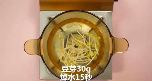 4放入豆芽焯水15秒后捞出。