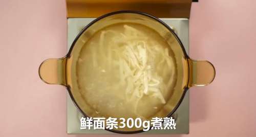 6鲜面条放入锅中煮熟捞出。