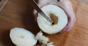 将一个雪梨沿着1/3处切开。横切面尽量与底部平行,去果核