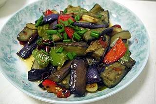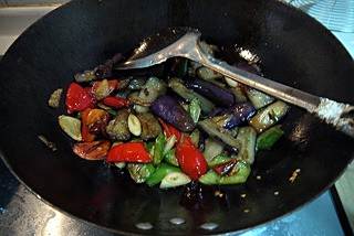 放入盘中的茄子,调入生抽,蚝油,胡椒粉,鸡精,稍稍翻炒待红椒和青椒熟后起锅装盘。
