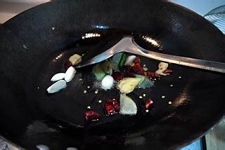 待油稍稍冷却后,不超过5成热,小火,放入姜蒜干辣椒和郫县豆瓣稍稍翻炒。
