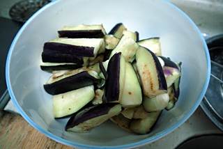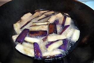 起锅放能淹过所有茄子的油下茄子炸1-2分钟,太久会使茄子变得很软,卖像不好。用漏勺捞起茄子放到盘中。锅中留少量油。