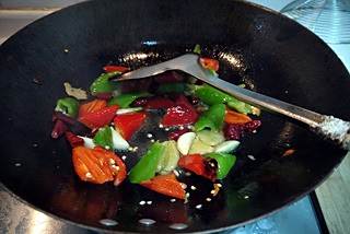 稍稍翻炒姜蒜干辣椒后,放入红椒,青椒,黑豆鼓,调入半小勺盐,炒至7成熟。
