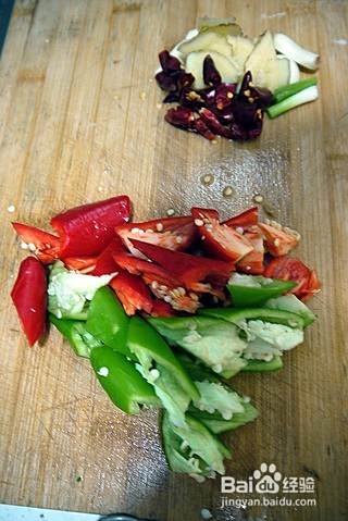 在腌制的过程中,准备配料,红椒和青椒各一个切成2厘米见方的三角型。姜蒜切厚片,干辣椒切小段。