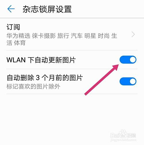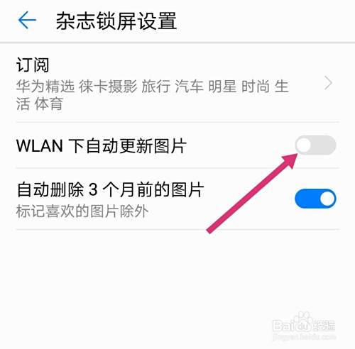 进入杂志锁屏后,点击“WLAN下自动更新图片”旁边的按钮,如图。