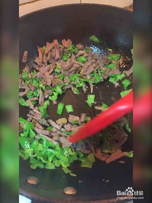 锅烧热倒入花生油,加入青椒和牛肉翻炒至青椒熟了即可,加入少量生抽和盐