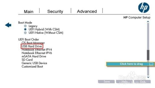 继续向下,将UEFI Boot Order中的USB hard drive 提前即可通过USB设备启动。