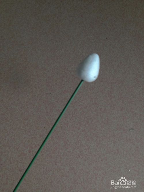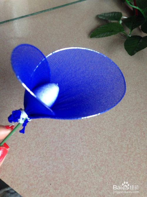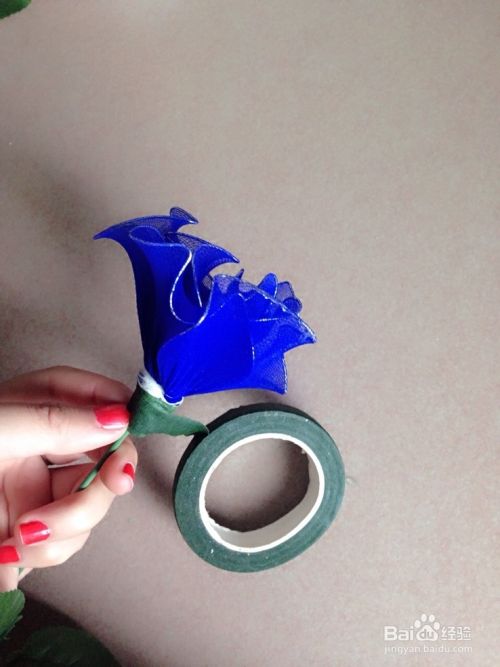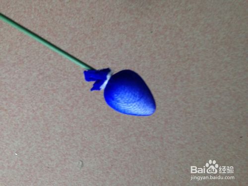 将花心模具,插在花杆上,用彩色丝袜将其包裹,后用棉线打结。