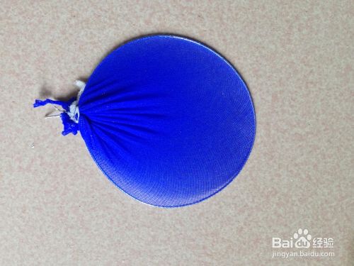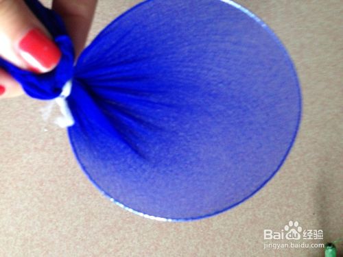 将彩色丝袜,把圆环包住,然后用棉线打结,最后将多余的丝袜剪掉。