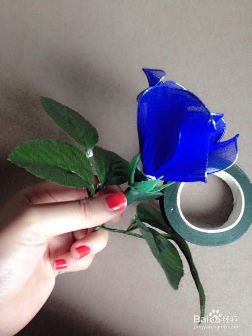 花瓣形状捏好以后,用绿色胶带将带有棉线部分进行大概的遮挡,然后将花帝,花叶穿入花杆中。最后用绿色胶带从头到尾缠绕一圈。
