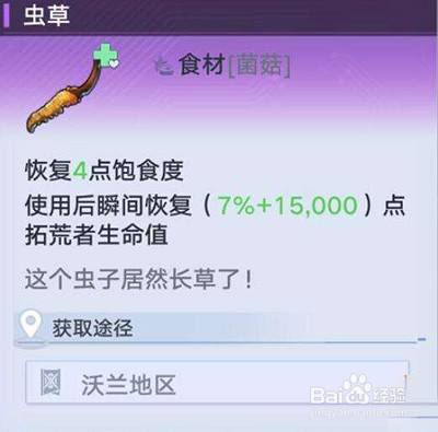 获取途径:沃兰地区,虫草是一种比较特殊的菌菇类食材,生长的环境也比较特殊,建议玩家们在沃兰地区寻找采集。
