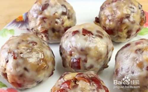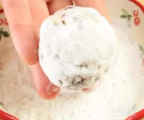 搅拌好的食材取一小坨放入手心,用力捏紧实,然后搓成圆球,然后再将表面裹上一圈糯米粉