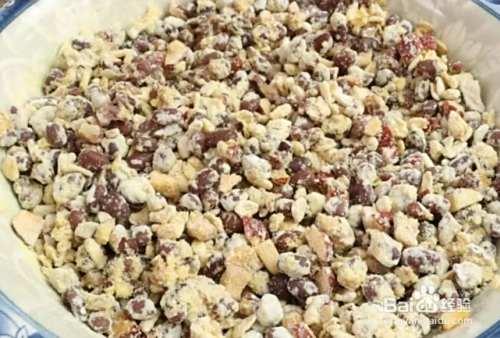 接下来把煮好的红豆放入到碗里,加入切好的红枣丁、燕麦片、两勺糯米粉、两勺玉米面,用筷子搅拌均匀,让所有的食材都粘连在一起