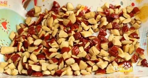 准备一小把红枣,洗干净之后去掉枣核,把红枣切成红枣丁,装在碗里备用。