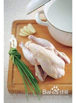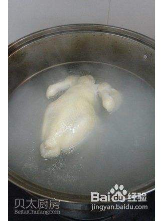 另取一锅清水,放入葱段和拍破的姜块大火煮开,放入三黄鸡继续用大火加热,水沸后捞出鸡再次冲凉,随后再次放入滚汤中大火加热至沸腾,然后调成小火加盖焖煮8分钟,熄火后再闷10分钟。