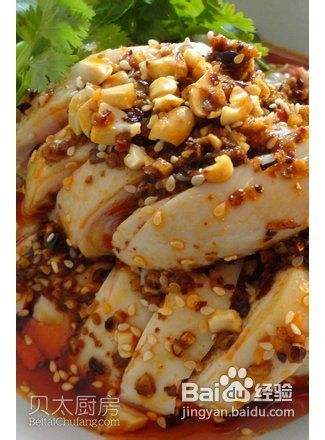 三黄鸡从冰水中取出,晾干后斩成2cm宽的大条,装盘后淋入调味汁,撒上白芝麻和花生碎,最后装饰香菜叶即可。