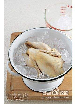 熄火后准备好一盆冰水,三黄鸡闷够10分钟后捞出,马上浸入冰水浸泡20分钟。