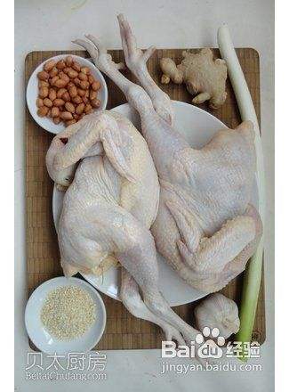 三黄鸡去除内脏、杂毛和趾甲,用流动水冲洗干净。放入煮锅中,加入能够浸没三黄鸡的冷水大火烧开,出尽血沫后捞出三黄鸡再次用冷水冲洗干净。老姜一半切碎,一半拍破。
