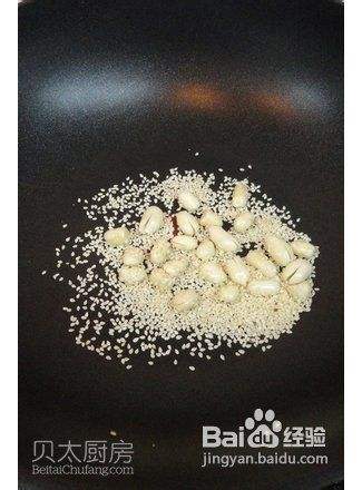取一只干净的炒锅,放入白芝麻用小火加热,同时不停翻炒白芝麻,直至散发香味并颜色微焦,盛出备用。用同样方法处理花生仁,然后切碎备用。