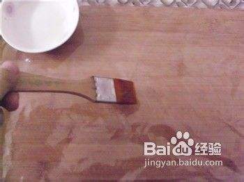 在案板上铺上一层保鲜膜,在保鲜膜表面刷上少许的食用油。