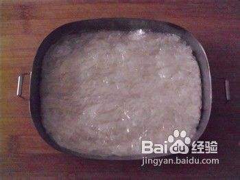 把保鲜膜放在方形的容器里,倒入拌匀的米饭。