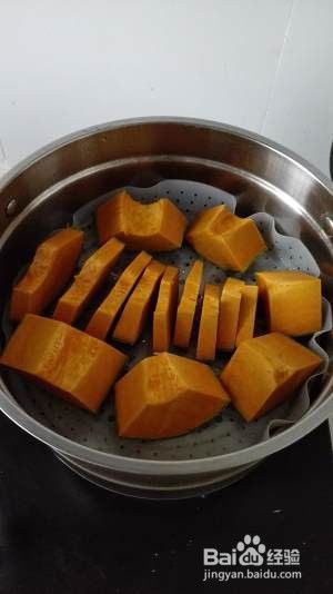 南瓜切小块,称260克左右,放在蒸架上,蒸10分钟。注意要隔水蒸,不要放在水里煮。另外蒸锅里直接用冷水,大火,蒸十分钟。图里大块的是直接吃