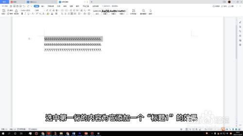 来到WPS软件主页,选中第一行的内容为它添加一个“标题1”的效果。