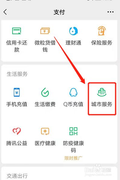 在微信支付页面,点击城市服务。