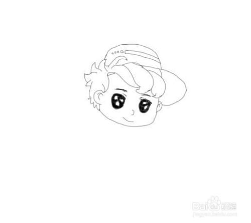 再在头发的上面再画出男孩的帽子,然后在帽子上画出帽子上面的纹理图案,如图所示: