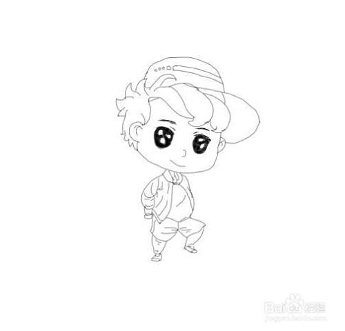 最后在身体的下面再画出男孩的两条腿及脚部,这样Q版男孩就画好了,如图所示: