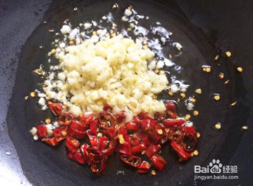 锅里放油,小火烧至油5成热时,放入干辣椒和蒜末爆香。