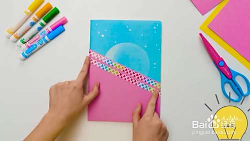 接下来再拿出彩色胶带装饰一下这个彩纸的表面,按照自己的喜好装饰。