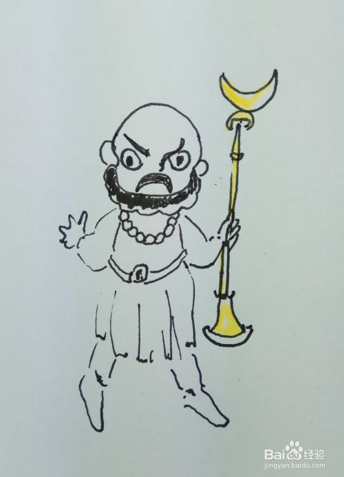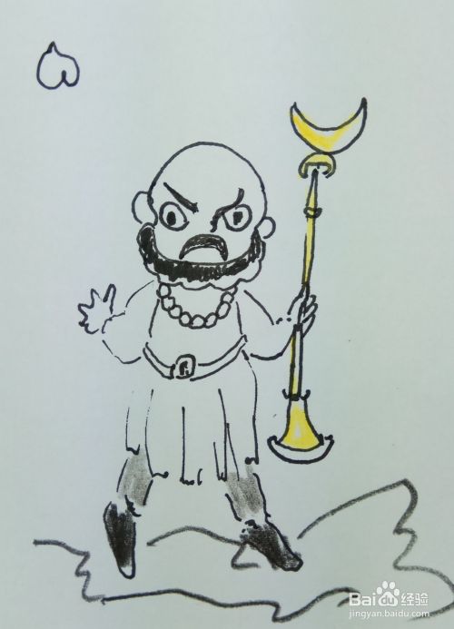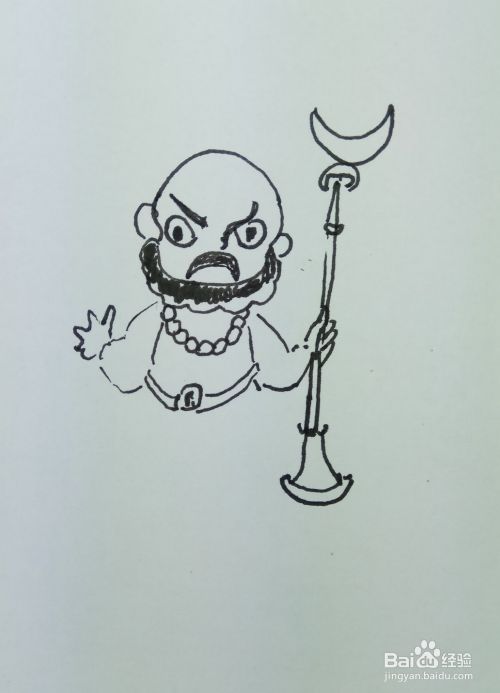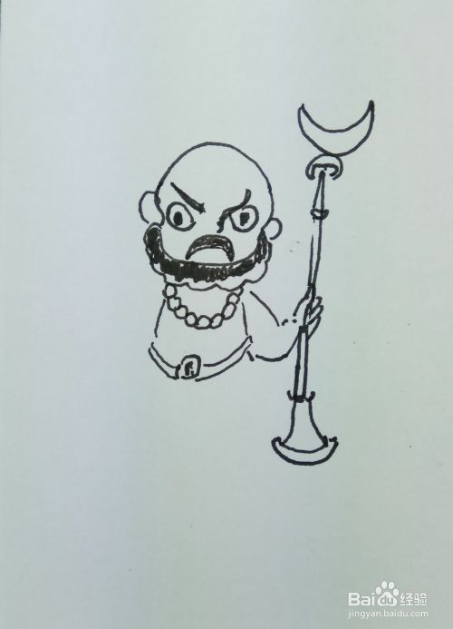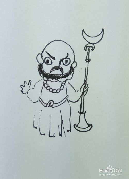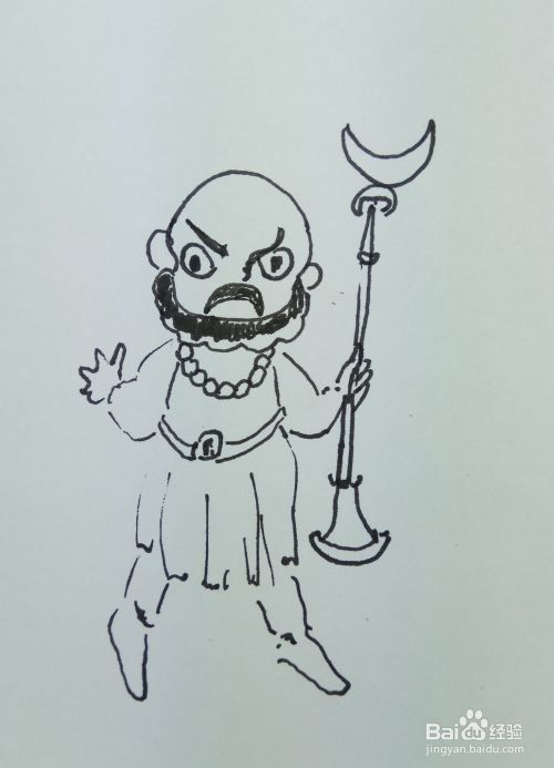 在白纸上用线条和曲线画出沙和尚的头部轮廓,然后再画出它的眼睛,鼻子,眉毛,胡须和他的耳朵部分,画出他的身体部分,还有他脖子上挂着的佛珠,还有他手里拿着的武器。