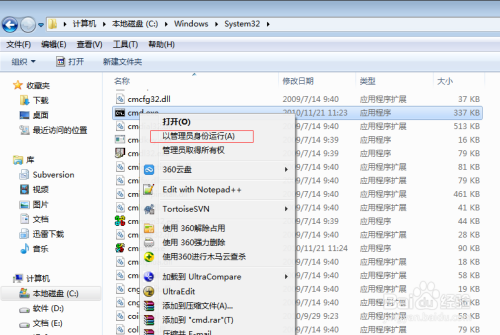 首先找到cmd.exe这个程序(win7系统可以在C:\Windows\System32中找到或者“开始->搜索程序和文件中输入cmd.exe找到,其他系统请自己bd),右键”以管理员身份运行“。