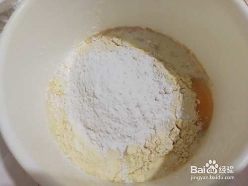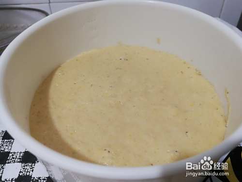 白糖,酵母,放入盆中,磕入鸡蛋,放入面粉,玉米粉加适量温水搅拌成干一点的糊状,盖上盖发酵。
